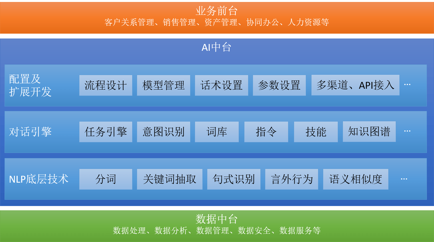 以开放性为核心建设思路,将AI的能力封装为中台的方式输出,强调平台性、可复用性以及可扩展性,能够根据企业的实际应用场景快速搭建智能应用。同时提供模型学习和模型运行监控托管服务,方便前台业务快速上线智能应用。