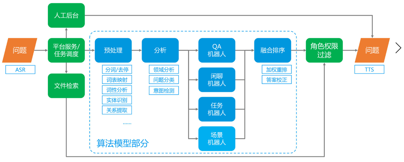 AI机器人是由多个机器人组成,包括问答机器人、闲聊机器人、任务机器人等,人工后台以及文档库之间协作完成任务,最终选择最优答案返回给用户。