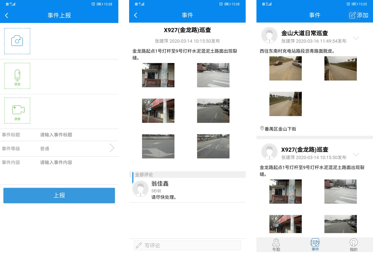 现场执行任务或巡检时,如发现异常事件,可通过拍照、录像、录音等方式进行取证并实时上报后台,后台跟进处理