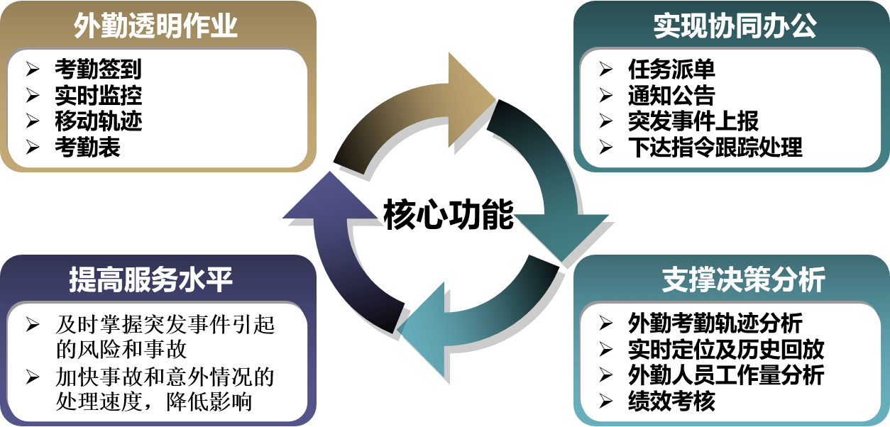实现待办任务推送、待办详情查看、现场作业(工作检查清单、拍照、视频等)、实时上传后台、后台跟进反馈等各个环节的闭环流程,进行高效的协同工作