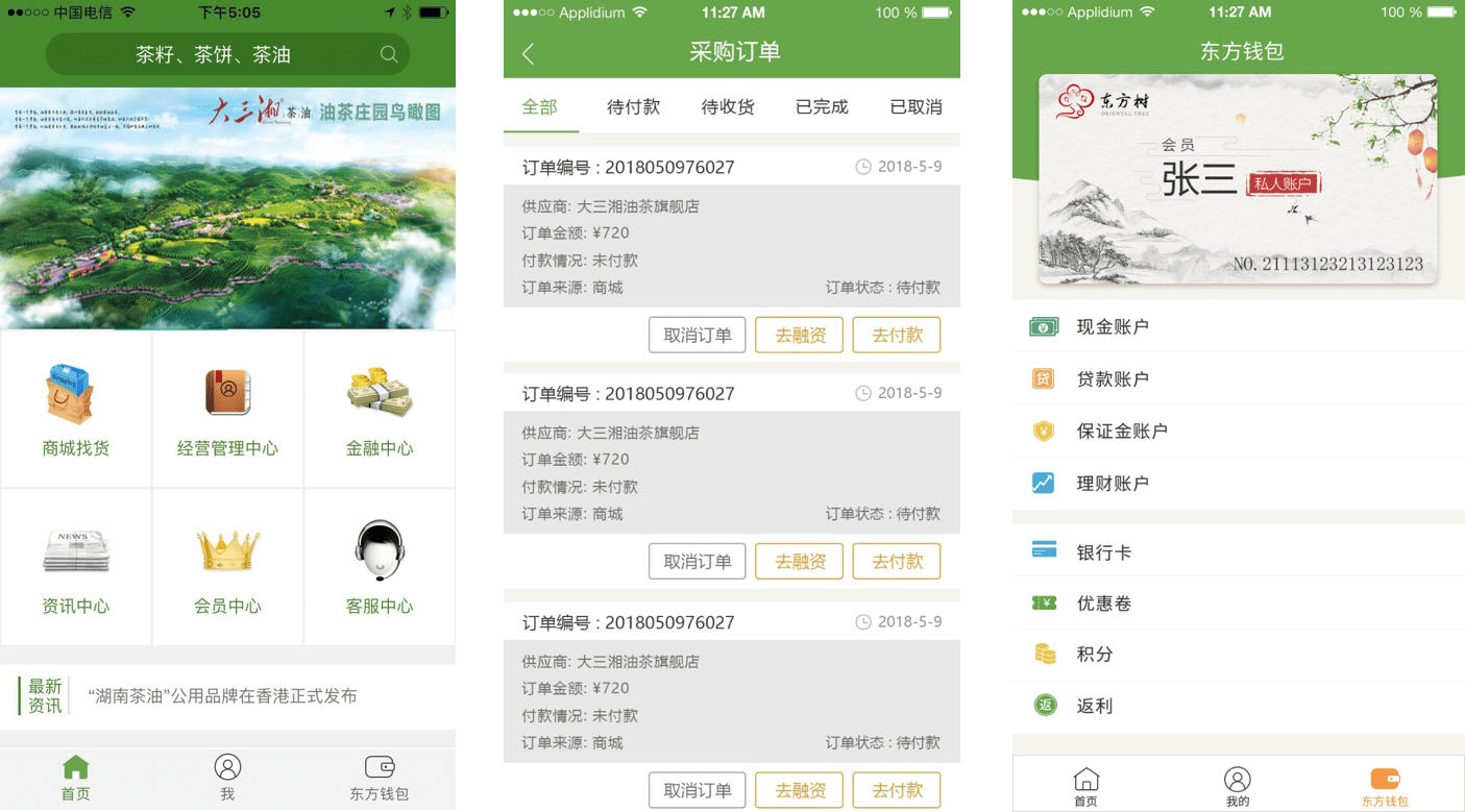 APP端核心功能主要包括电子商城、融资申请、订单管理、商铺管理、电子钱包等功能。