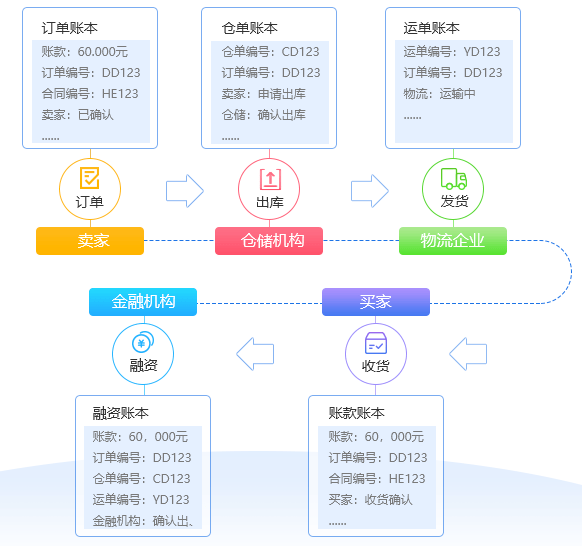 区块链是由节点参与的分布式数据库系统,它的特点是不可更改,不可伪造,也可以将其理解为账簿系统。通过将订单流、物流、发票流及资金流等交易信息在不可篡改的区块链上实时记录并多方校验,増加舞弊成本,保证贸易真实性,可有效避免在供应链各节点上的道德风险。通过查看并分析历史的还款及逾期情况有助于进一步降低信用风险。
