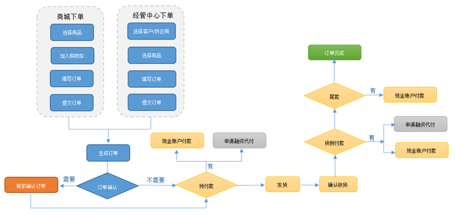 1. 平台的订单来源分别为“在线商城”中的采购订单,以及“经营管理中心”中给自己的客户/供应商下达销售/采购订单